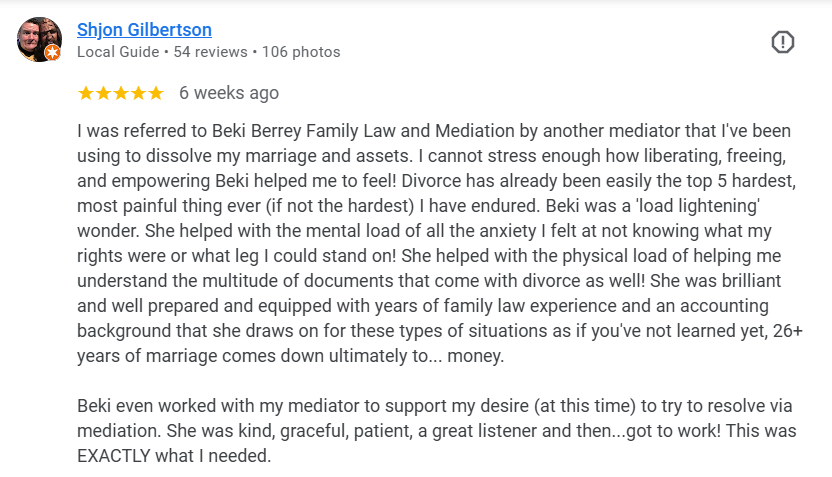 Beki navigated the courtroom with ease and confidence. She thoroughly explained all steps and procedures. She was able to reduce the stress and anxiety that comes with these types of cases. She put me at ease and explained everything she was doing and why. She is knowledgeable, effective, efficient and kind. She truly did not lack. She’s a well-rounded attorney and person. I would absolutely hire her again if I needed a family law attorney, she is the attorney you want in your corner. ~ Michael T.